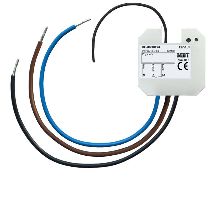 A Tomada KNX RF+ da MDT recebe telegramas KNX / EIB e permite comutar uma carga elétrica ligada à tomada. Este dispositivo comunica através do