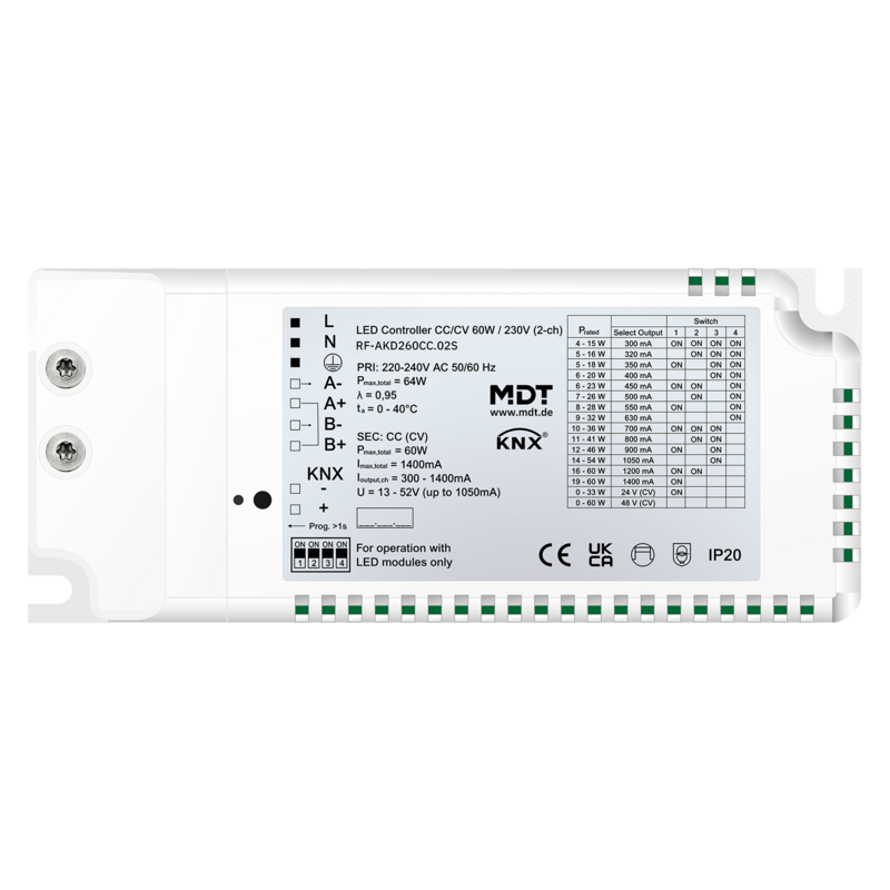 O Controlador LED KNX RF+ CC/CV 30 W da MDT é um controlador LED compacto com fonte de alimentação integrada, compatível com LEDs de corrente