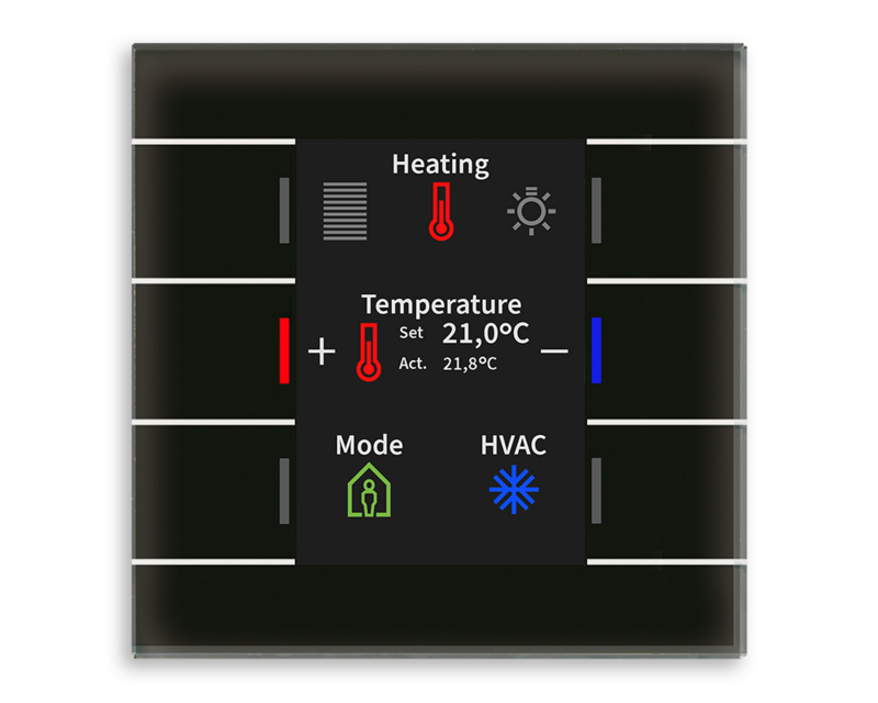 O Controlador de Temperatura Ambiente em Vidro permite o controlo da temperatura ambiente, incluindo redução automática do valor de setpoint com base na radiação solar.