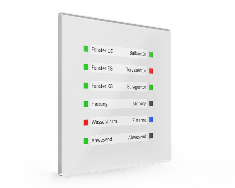 O Indicador LED em Vidro MDT permite visualizar funções lógicas universais e estados do edifício num sistema KNX. Podem ser apresentados três estados distintos através